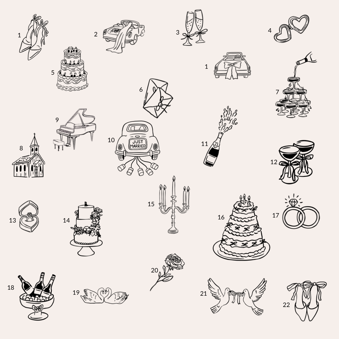Choose from our range of charming illustrations (car, piano, church, and more!) to match your wedding theme, or mix and match designs to tell your love story through every table.